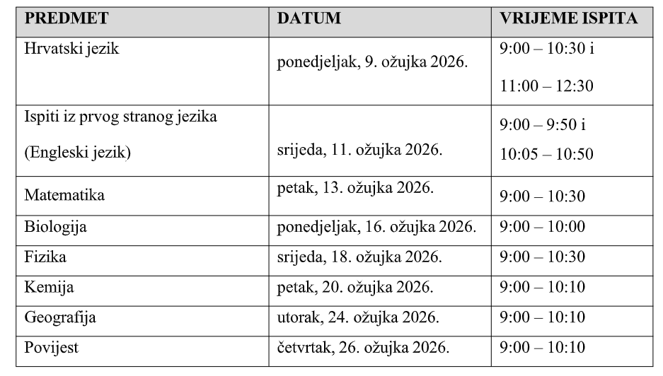 ispite iz Hrvatskog jezika, Engleskog jezika, Matematike, Biologije, Fizike, Povijesti,